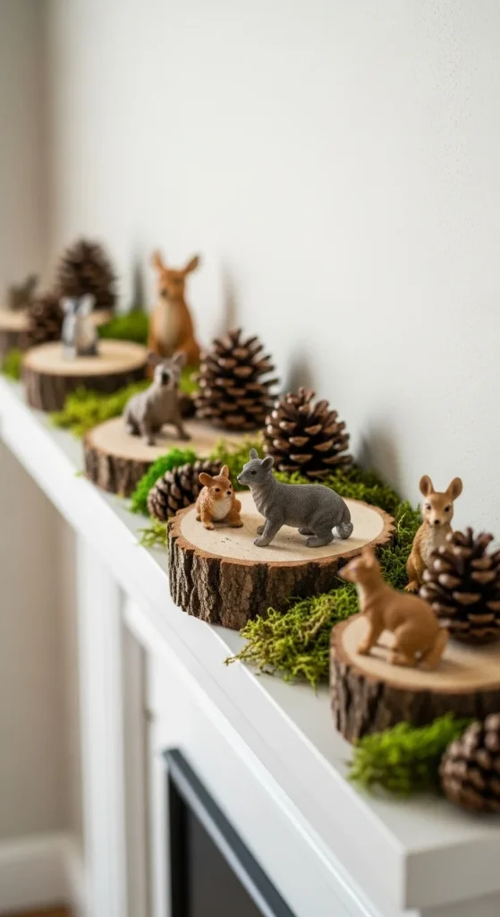 Transform your mantel into a forest-inspired retreat. Use natural wood slices, moss, and animal figurines like deer or owls. Layer greenery and soft lights for a magical touch. This whimsical look feels cozy and natural—especially perfect for cabins or rustic homes.