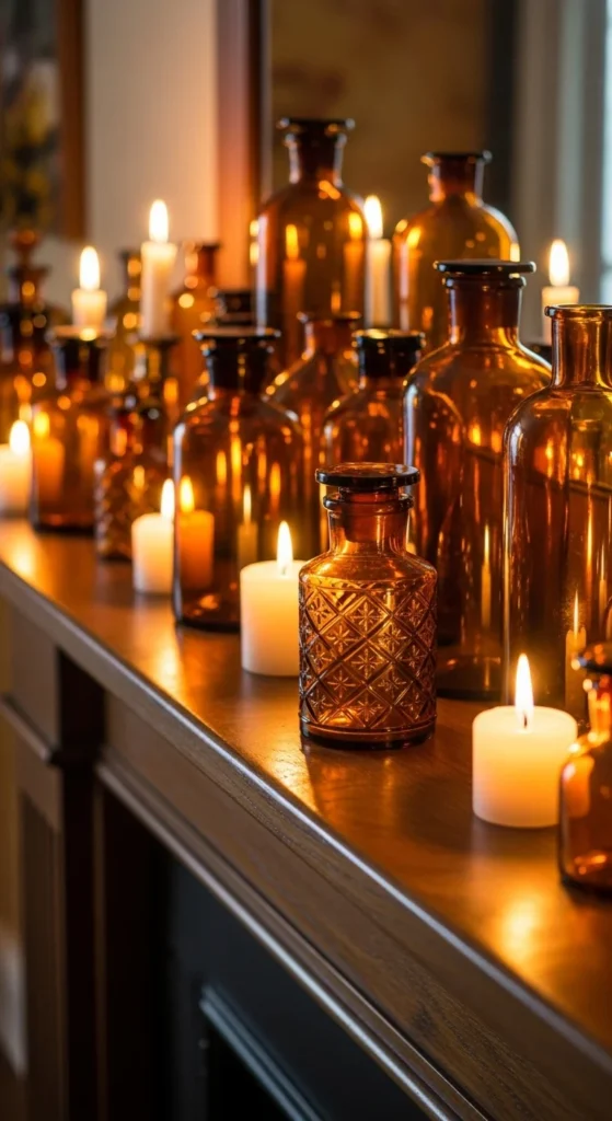 Amber glass instantly adds richness to your fall decor. Collect jars, bottles, or candleholders in amber or smoky brown. Arrange them in groups of three or five for visual balance. Add dried stems or small branches for a natural touch. The glass catches the light and enhances that warm, golden glow.