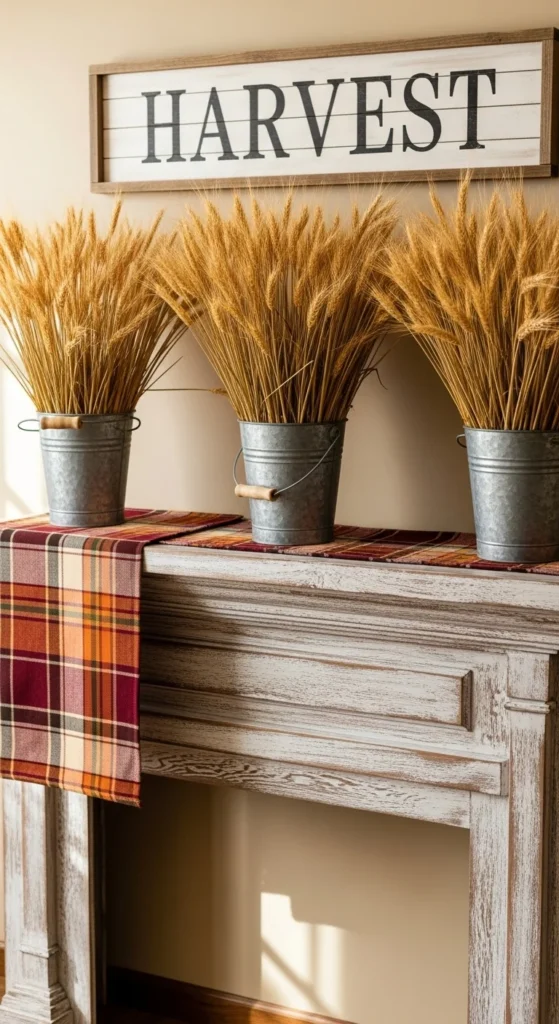 Embrace rustic simplicity with a farmhouse-inspired mantel. Use weathered wood tones, galvanized metal, and natural textures like burlap or linen. Fill mason jars with wheat stalks or cotton stems, and finish with a plaid throw draped nearby. This down-to-earth look celebrates autumn’s countryside beauty and pairs perfectly with cozy evenings by the fire.