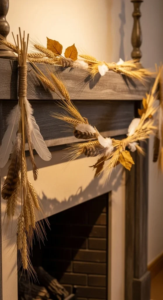 Combine natural materials for an understated yet beautiful garland. Tie together wheat stalks and soft feathers with jute twine. Drape it across your mantel and secure with small hooks. This subtle combination adds texture and warmth while keeping the look organic and serene.