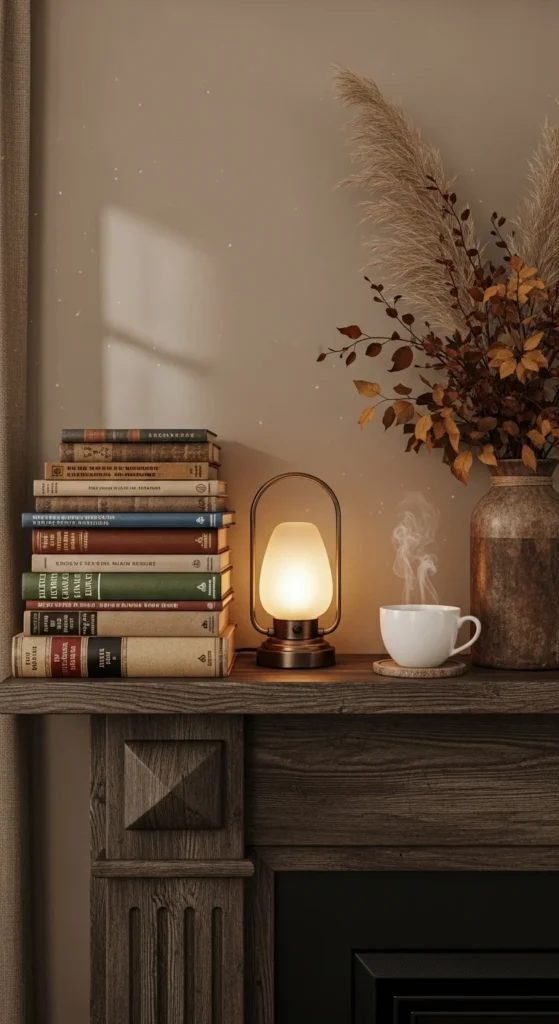Turn your mantel into part of a reading nook. Stack old books, add a small lamp, and include cozy touches like a mug or candle. Keep warm tones and natural elements to match fall’s charm. It’s both functional and inviting—perfect for book lovers.