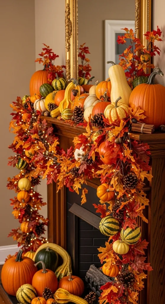 Go all out with a pumpkin-filled display. Mix textures—smooth, ribbed, velvet, and ceramic—to add visual variety. Let some pumpkins spill onto the hearth below for a layered effect. This playful look brings the charm of an outdoor pumpkin patch right into your home.