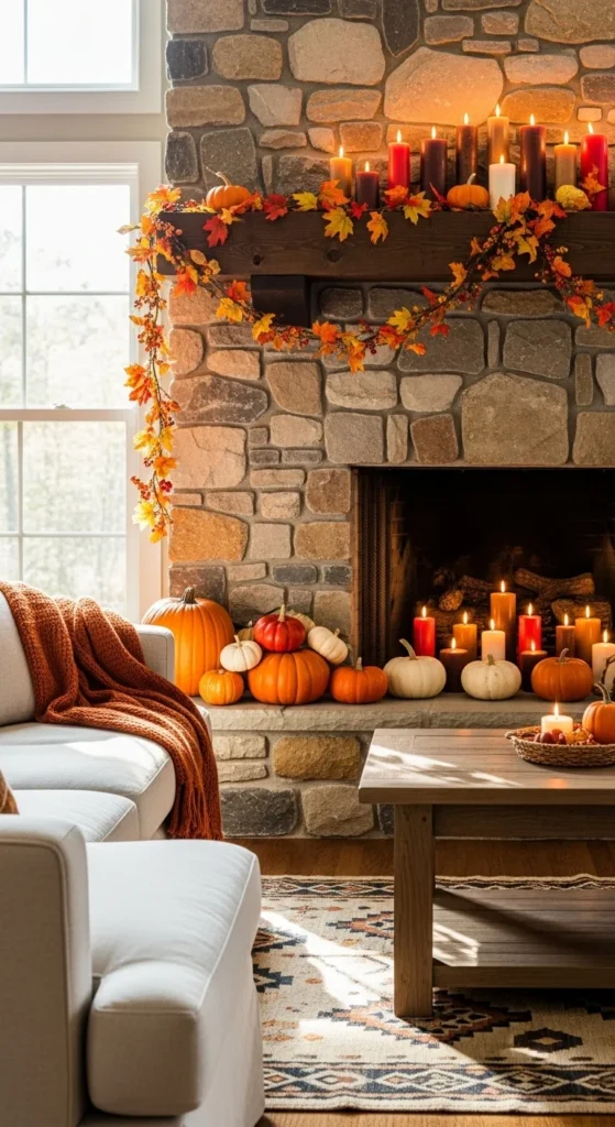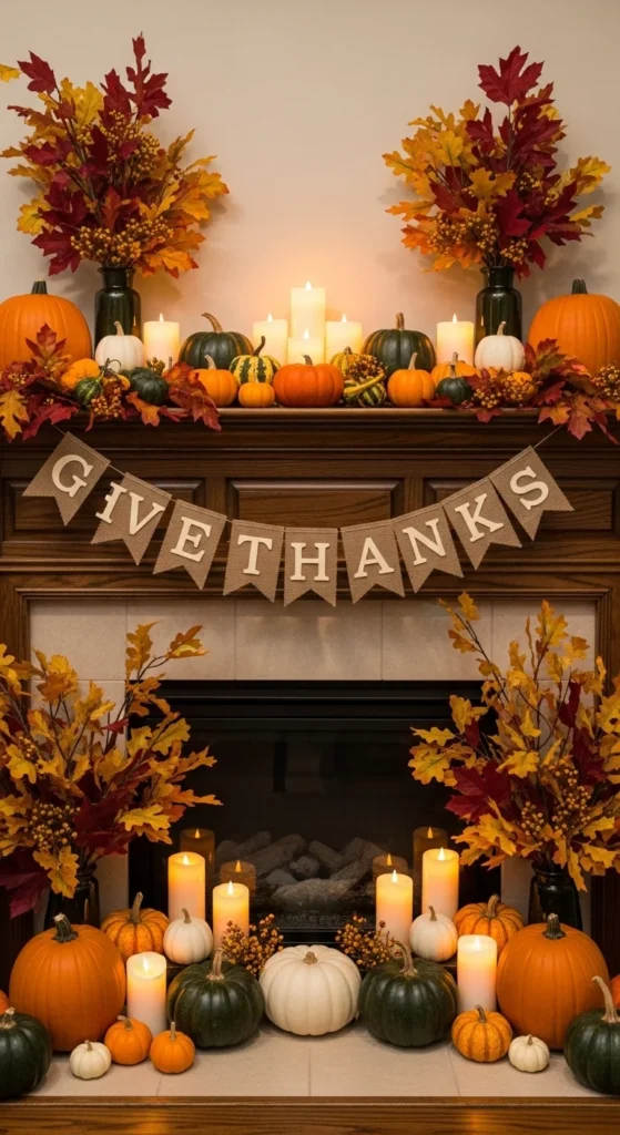 End the season with a mantel ready for Thanksgiving. Use a “Give Thanks” or “Grateful” banner as a centerpiece. Add pumpkins, candles, and foliage that reflect the harvest spirit. This setup transitions seamlessly from general fall decor to holiday hosting, making it both beautiful and practical.