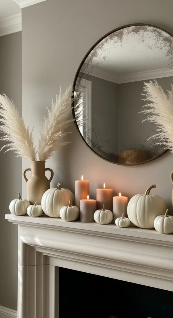 Sometimes simple is best. Line your mantel with mini pumpkins for an easy yet eye-catching fall setup. Alternate colors and sizes for balance. Add greenery or fairy lights for a whimsical touch. It’s charming, festive, and takes less than ten minutes to assemble.