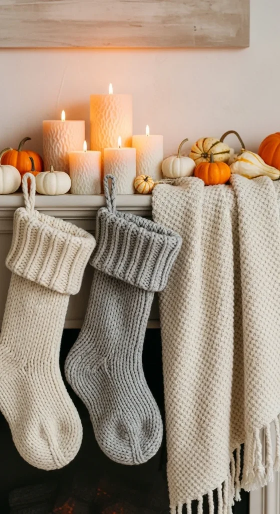 Soft textures instantly make a space feel warm. Drape a chunky knit throw or hang cable-knit stockings across the mantel. Mix in natural materials like wood or clay to balance the softness. Neutral knits pair beautifully with candles and pumpkins for a cozy, inviting setup that feels homey and modern.
