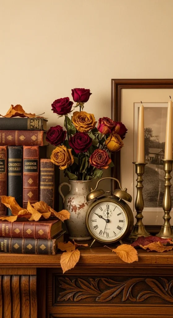 Mix antique finds with fall touches for timeless charm. Stack vintage books, add an old clock or framed mirror, and tuck in dried roses or pressed leaves. The worn textures and muted tones create warmth and a sense of history. This style looks beautiful in both traditional and eclectic homes.