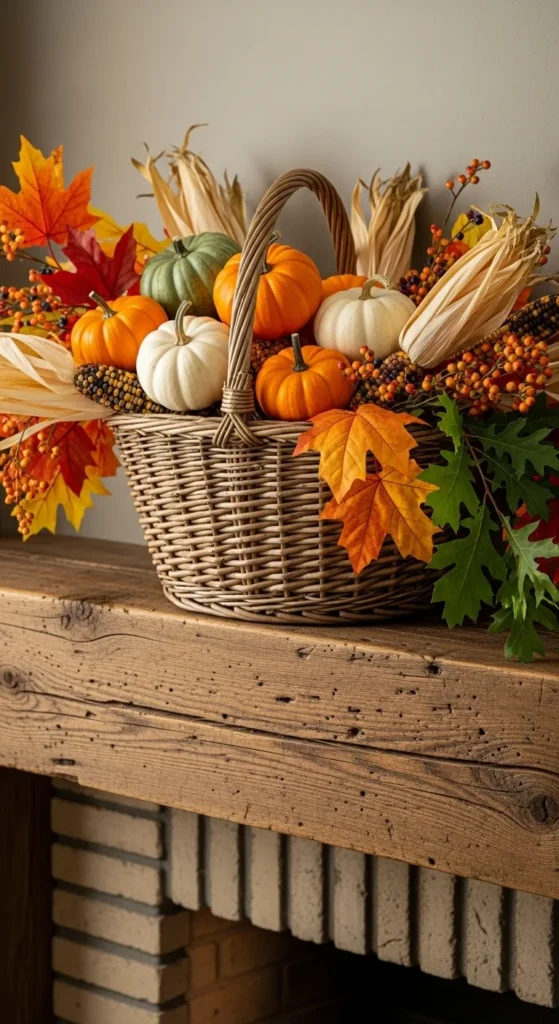 Place a woven basket on your mantel and fill it with seasonal staples like pumpkins, gourds, and faux corn husks. Layer in a few leafy stems or small pinecones for texture. It’s a low-cost centerpiece that adds volume and charm. Use different basket shapes to vary the look throughout the season.