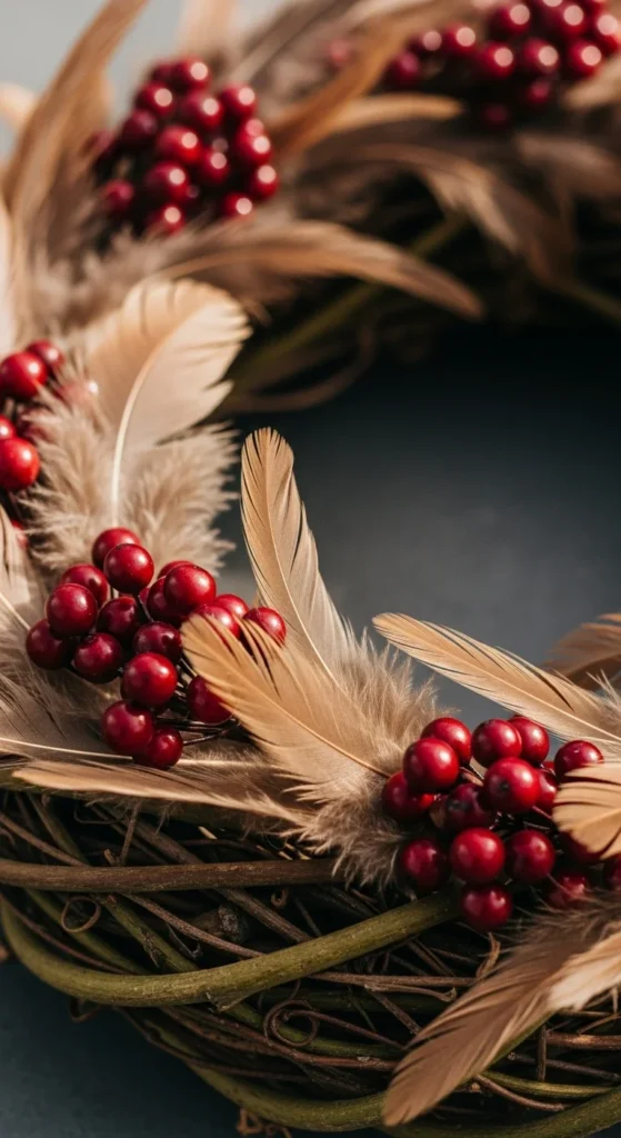 Feathers add movement and gentle flow. Combine them with faux berries for depth. Start by placing feathers around the frame, then layer berries on top. Keep the colors warm and earthy to fit the season. This wreath has a soft, natural personality and pairs nicely with wooden doors. It’s also very lightweight, making it easy to hang.