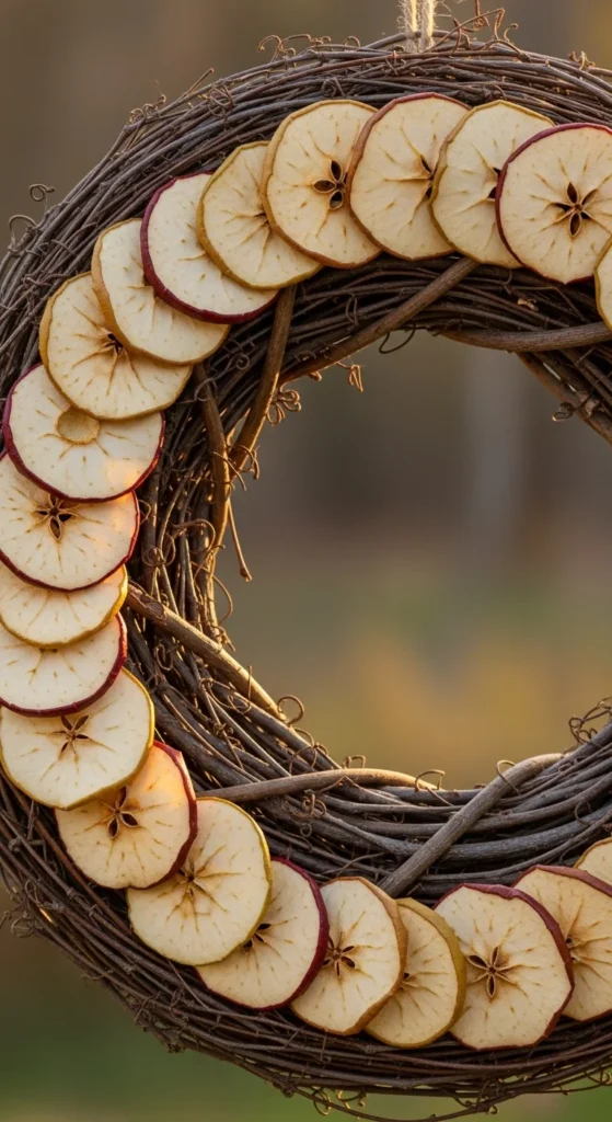 Dried apples add gentle red tones that fit fall well. Slice apples thinly and dry them in the oven. Once ready, attach them around a twig-covered vine frame. The twigs add structure without feeling heavy. This wreath smells pleasant and feels simple and natural. It’s great for homeowners who like understated materials. Use twine for hanging to keep the style cohesive.