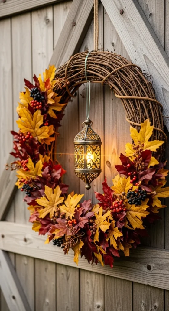Place a small lantern in the center of a grapevine wreath for a standout design. Use a lightweight lantern so the wreath doesn’t sag. Add dried leaves or berry sprigs around the edges. This creates a cozy focal point that feels seasonal. You can place a battery tea light inside the lantern for soft evening glow. It’s simple and charming but looks unique on the door.