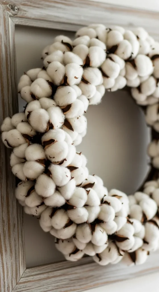 Cotton stems create soft contrast with darker doors. Use a wire frame and place the cotton stems evenly around the ring. Add a single ribbon at the top if you want extra charm. The cotton gives a calm, neutral look that fits well with fall decor. This wreath is also lightweight and long-lasting, making it a solid option if you want something simple yet warm.
