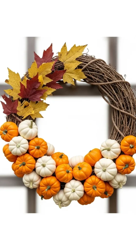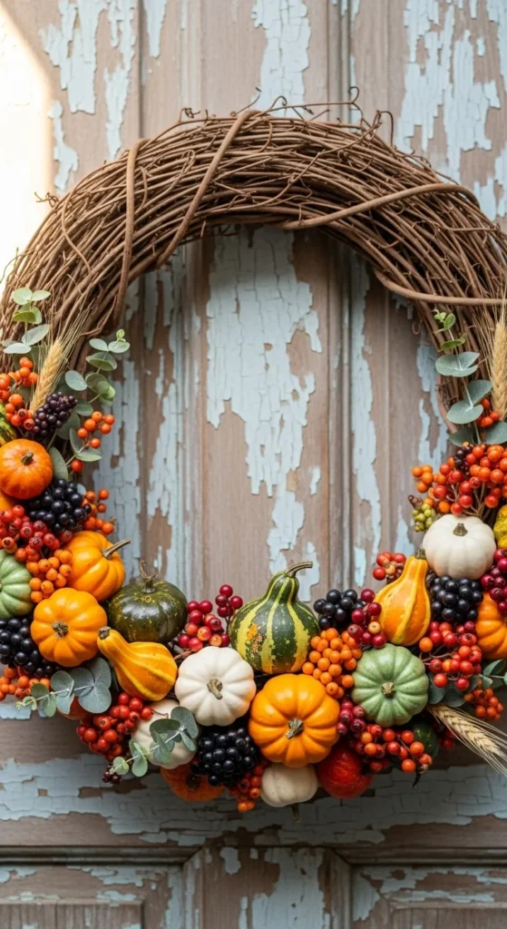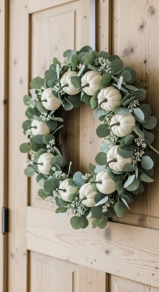 Neutral tones can still feel cozy. Use small white pumpkins and eucalyptus sprigs for a calm, modern look. Attach the pumpkins off-center for a slight asymmetry. The eucalyptus softens the design and adds fullness. This wreath works best for homes that prefer understated decor. If you want variation, mix in a few soft gold accents. It’s simple, stylish, and budget-friendly.
