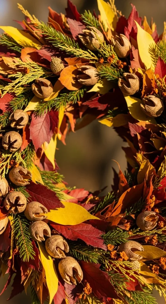 Gather mixed leaves from various trees for a wild, layered look. Add tiny pine sprigs or seed pods to deepen the texture. This design looks natural and relaxed, perfect for cottage-style homes. Use a vine frame to keep the shape loose. You can refresh the foliage as needed through the season, making this an ongoing creative project.