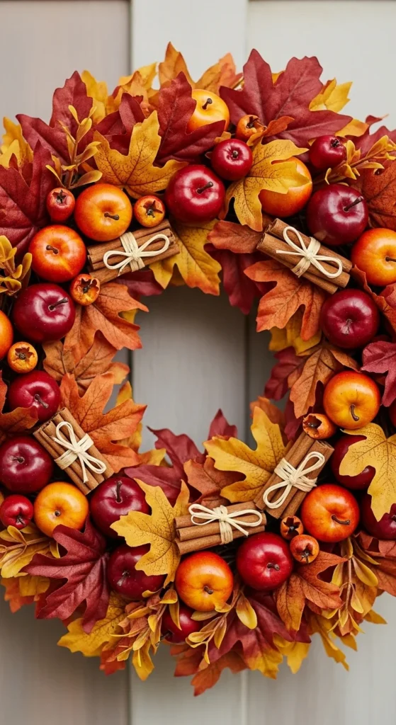 This wreath gives a warm, kitchen-inspired feel. Use faux apples so the wreath lasts longer. Add cinnamon bundles between the apples to give structure. Attach a few soft leaves to tie colors together. This design works well with farmhouse porches or wooden entryways. It’s a classic fall combination that looks full without being complicated.