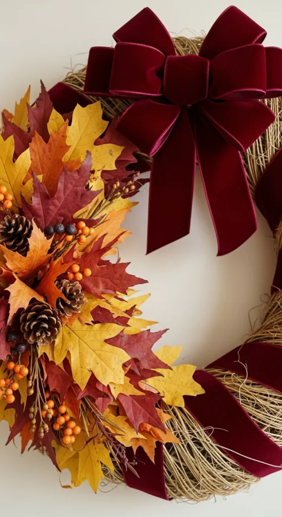 Velvet ribbon adds soft luxury to fall decor. Wrap the ribbon loosely around a foam ring and let some of the base peek through. Add a leaf cluster on one side for contrast. The mix of texture and color feels warm and inviting. This wreath is perfect if you want a slightly dressier look on your entry. It’s easy to customize by changing ribbon colors.