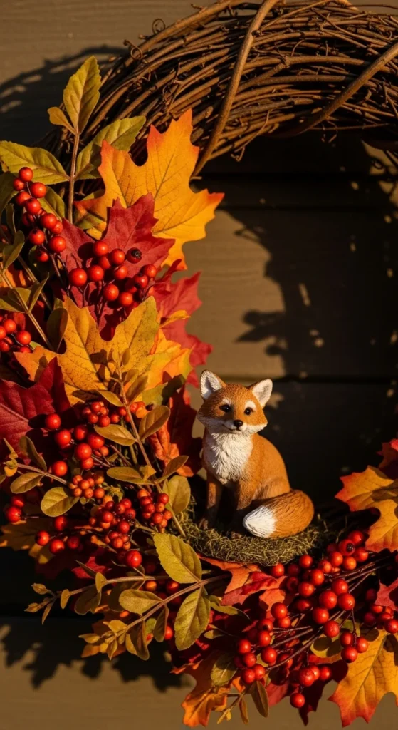 Adding a small woodland animal figurine creates personality. Choose a fox, owl, or hedgehog and place it at the bottom of a leaf-covered wreath. Add a few berries or pine sprigs around it to make it feel settled. This wreath is playful, warm, and perfect for families. It also becomes a fun annual decor piece you can reuse each year.