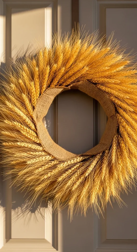 A wheat wreath brings farmhouse calm to your entry. Pick up dried wheat bundles and secure them around a foam ring. Angle the pieces in the same direction to create movement. Wrap a wide burlap ribbon near the bottom for structure. The colors look warm and inviting without feeling busy. This wreath works well for large doors because wheat fills space easily. If you want it fuller, add a double layer. It lasts all season with no upkeep.
