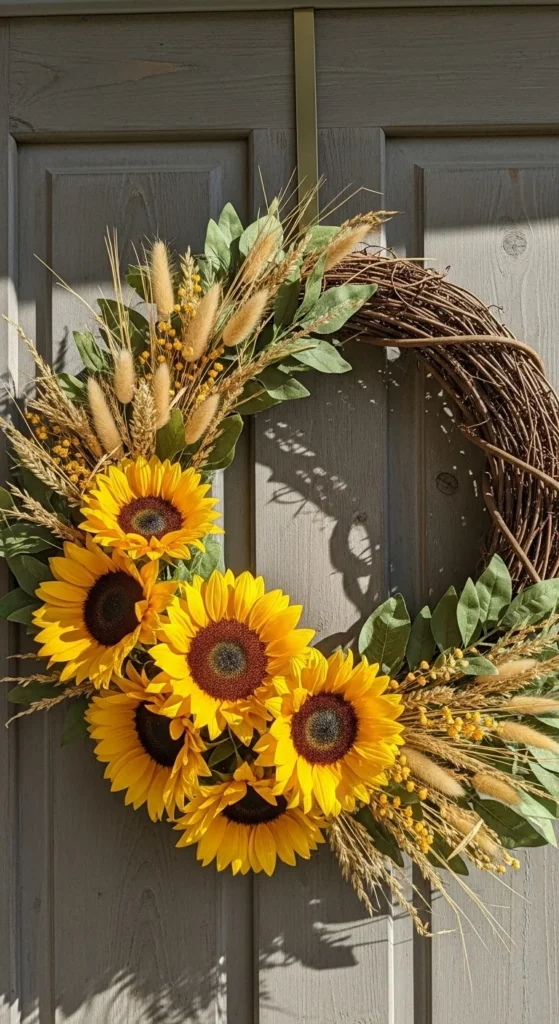 Sunflowers bring cheerful energy to fall decor. Use a grapevine base and attach big blooms around the bottom half. Add dried grass stems along the sides for soft texture. Keep the top simpler so the flowers feel balanced. This wreath stands out from a distance and works beautifully with light-colored doors. It’s easy to build and looks lively without being overwhelming.