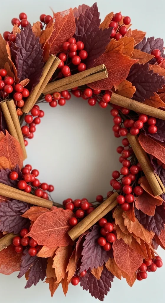 Combine cinnamon sticks and faux berries for a wreath that feels warm and inviting. Arrange the berries in small clusters around the ring. Add cinnamon sticks in groups of two or three for structure. This mix creates an earthy color palette that works well with any door style. Use a neutral ribbon to hang it so the details take center stage. It’s a quick project with a classic fall feel.