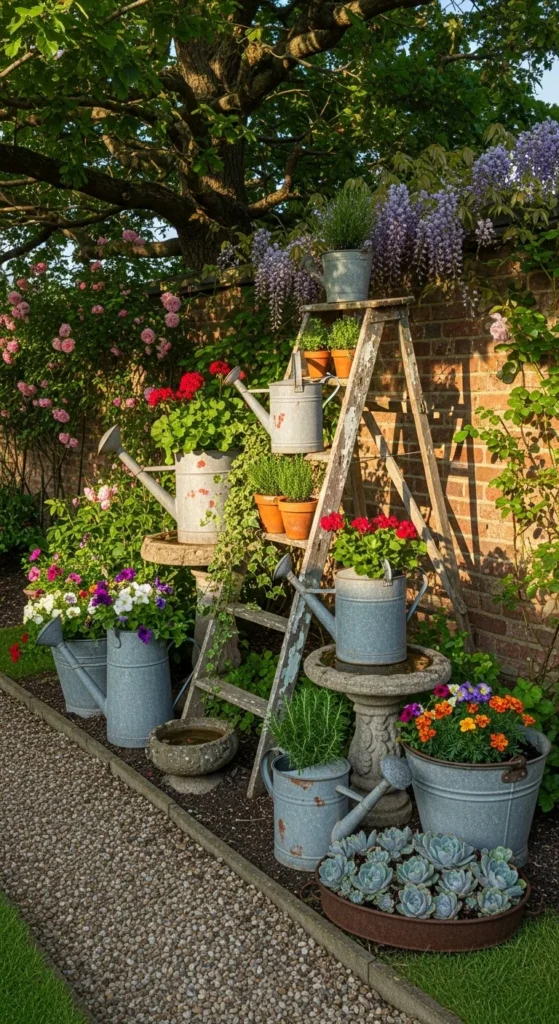 Turn old items into garden treasures. Use ladders as plant shelves, wheelbarrows as flower displays, or tin cans as herb pots. Repurposed pieces give your garden a personalized, lived-in feel while saving money and reducing waste.