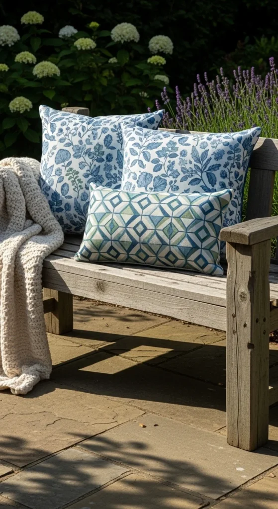 Add comfort and style with weatherproof cushions. Choose patterns that complement your garden colors—florals for a classic look or geometric prints for modern appeal. Store them in a waterproof box when not in use to keep them looking fresh.