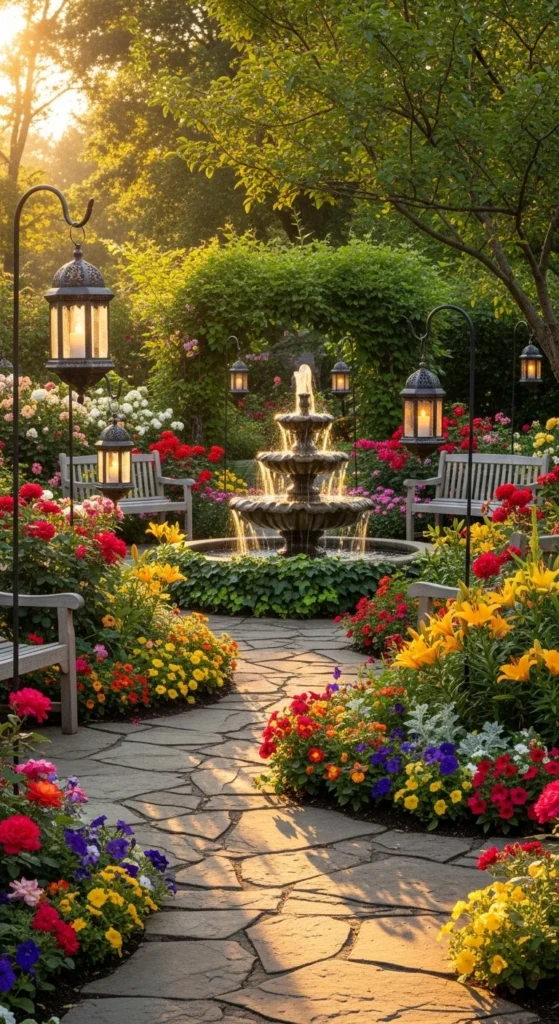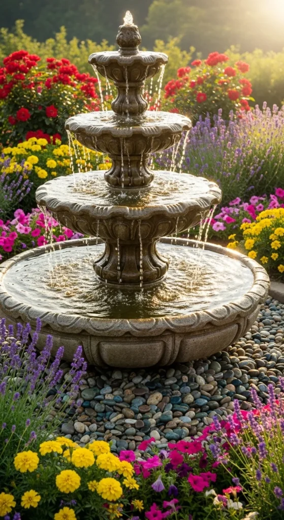 A fountain brings sound, movement, and elegance to your garden. Even a small solar-powered model adds tranquility. Place it near a walkway or in a flower bed as a centerpiece. Surround it with rocks or plants to make it blend naturally with the landscape.