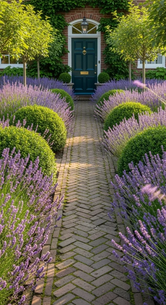 Border your garden path with low shrubs or flowering plants for a polished look. Lavender, boxwood, or ornamental grasses work beautifully. The structured greenery frames the walkway and makes your garden feel organized and cared for.