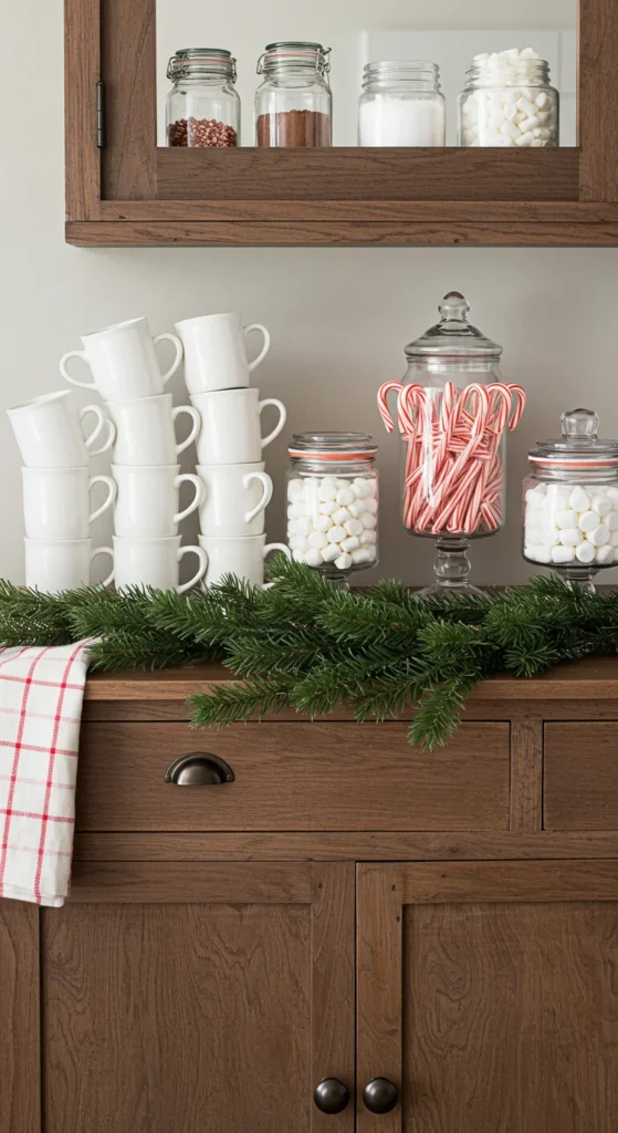 Set up a small table or sideboard with mugs, cocoa mix, marshmallows, candy canes, and whipped cream.