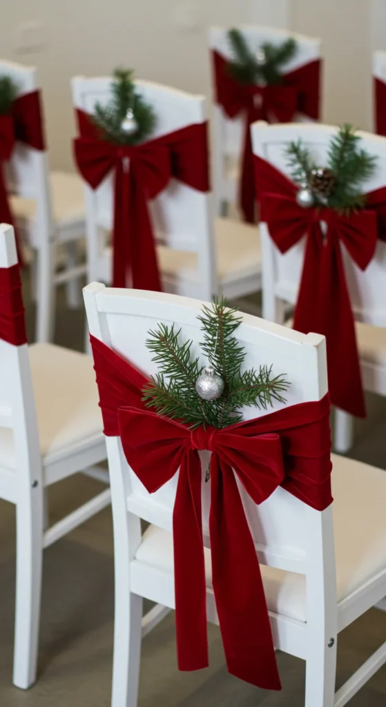 Tie ribbons or bows on chair backs and tuck in sprigs of pine or ornaments for a polished finish.