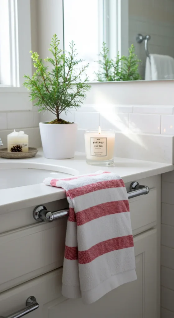 Swap in seasonal hand towels, add a small potted evergreen, and place a scented candle on the counter.