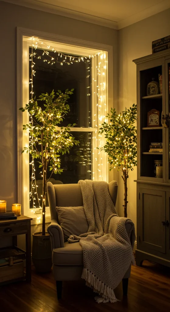 Drape garlands or twinkle lights along window frames to make rooms glow at night.