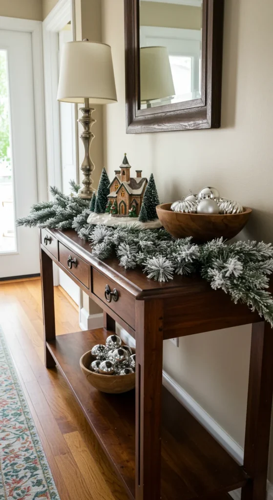 Style a console table with a simple garland, candles, and a decorative bowl of ornaments.