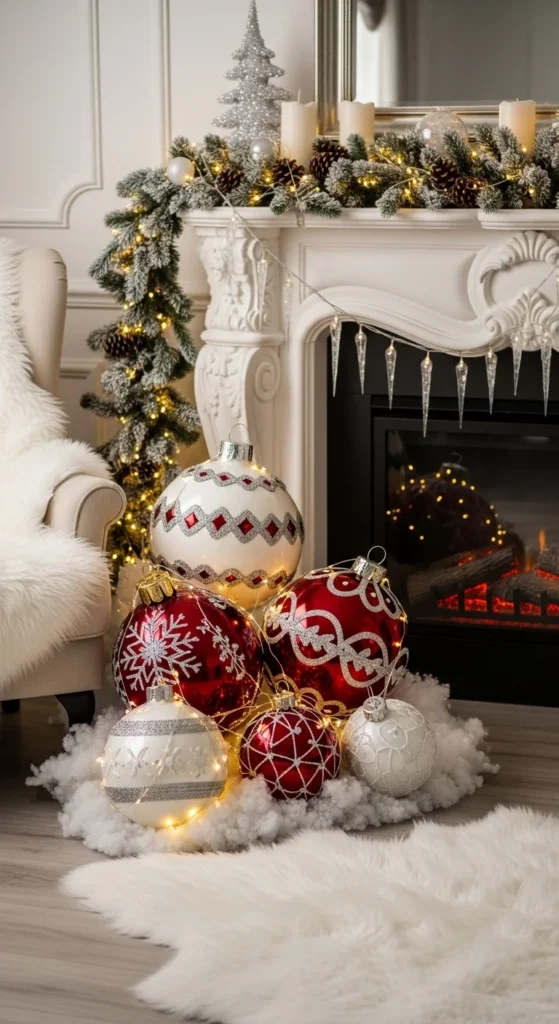 Oversized ornaments can make a room feel magical. Place them near a fireplace, under a console table, or next to your tree. Choose pieces that match your holiday palette for a coordinated look. You can also mix shiny and matte finishes for depth. If you want something budget-friendly, buy lightweight oversized ornaments made of plastic or foam—they look impressive without the heavy price tag. Add faux snow or a small lantern beside them for a cozy effect. This idea creates impact with just a few items and works well in larger spaces.