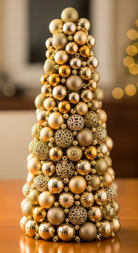 Create a cone-shaped ornament tree for a stylish tabletop display. Use a foam cone from a craft store and attach ornaments with pins or hot glue. Stick to one color family for a clean, coordinated effect. Mix matte, glitter, and glossy ornaments for texture. This project takes a bit of patience but uses inexpensive materials and results in a standout piece. It looks great on entry tables, dining buffets, or office desks. You can make multiple trees in different colors for a striking collection.