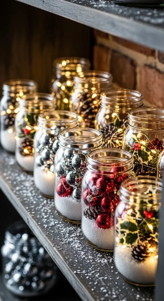 Fill mason jars with mini ornaments and faux snow to create charming decorative accents. Add a tiny battery-powered light strand inside each jar for extra sparkle. This is a budget-friendly project that works well with leftover ornaments. Arrange the jars in a row on a shelf, windowsill, or mantel. You can match the colors to your holiday theme or mix them for a playful look. It’s simple, quick, and perfect for adding small touches throughout your home.