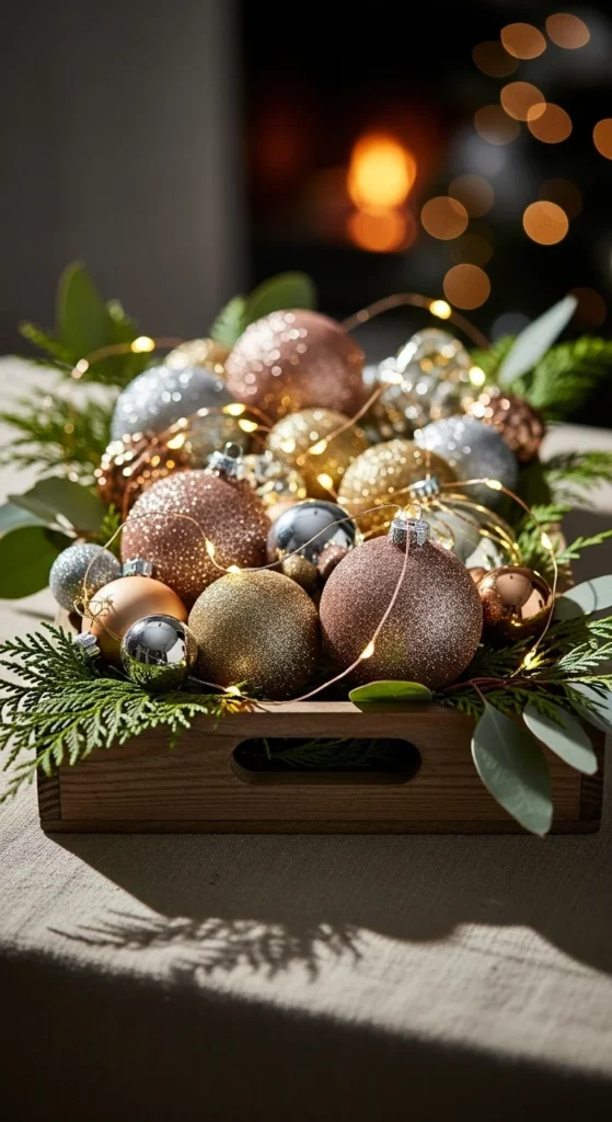 Fill a wooden bowl with glass baubles to make a centerpiece that feels warm and effortless. Mix metallic tones, transparent pieces, and different sizes for a relaxed look. Add small pine sprigs around the edges for a natural touch. This idea works well for coffee tables or dining tables because it takes only a few minutes to assemble. If you want a richer effect, tuck in a short battery-operated light strand. It adds a soft glow without taking over the arrangement. You can also use leftover ornaments from your tree to save money. Try combining matte and shiny finishes for more depth. This simple display looks inviting during daytime and even better at night when the lights reflect gently off the glass. It’s a quick way to create a festive highlight without buying extra décor.