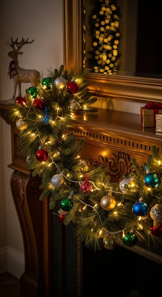 Clip mini ornaments onto a garland to create a cheerful accent for your mantel or staircase. Use small hooks or ornament clips to attach them securely. This idea helps add color and sparkle to otherwise plain greenery. Try mixing shapes—stars, bells, and small spheres offer a playful variety. Adding warm string lights helps the ornaments shine at night. For a coordinated look, stick to two or three colors that match your holiday style. You can reuse old ornaments or thrift inexpensive sets to keep costs down. This approach works well on long surfaces like shelves or banisters where the small details draw attention without cluttering the space. It’s a fun way to brighten up greenery and make your whole room feel festive.