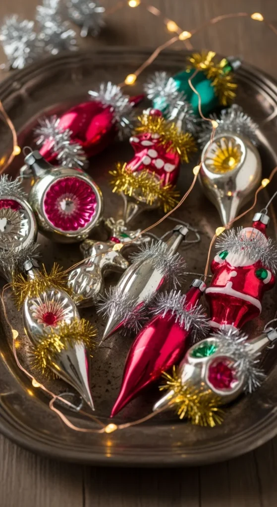 A vintage metal tray adds instant charm to old-fashioned ornaments. Choose classic shapes like teardrops, shatterproof balls, or striped pieces to recreate a nostalgic holiday look. Arrange them casually on the tray and tuck in a few tinsel strands for sparkle. If you enjoy collecting ornaments, this is a lovely way to display them without putting everything on the tree. Add small battery lights to highlight the colors. This setup works nicely on a coffee table, credenza, or console table. You can mix in new ornaments too, as long as they fit the retro aesthetic. This approach gives your holiday décor personality while keeping everything simple and accessible.