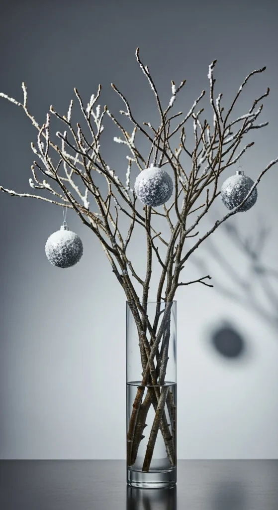 Place tall, bare branches in a vase and hang ornaments to create a beautiful minimal arrangement. Choose ornaments with snowy textures or frosted finishes for a wintery feel. This setup adds height and structure to your décor without requiring a full tree. It looks great in entryways, corners, or as a dining table statement piece. Use branches from your yard or pick up a bundle from a craft store to keep costs low. If you want extra sparkle, dust the branches with faux snow or a light glitter spray. Hanging only a few ornaments keeps the look clean and elegant. This idea works well in small spaces and creates a peaceful winter atmosphere with very little effort.