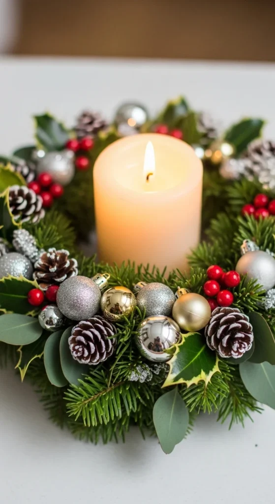 Create a charming wreath by placing small ornaments around a candle ring. Choose mini ornaments in matching colors so the wreath feels cohesive. Add sprigs of faux greenery to soften the edges. Place a pillar candle in the center to complete the look. If you prefer a safer setup, use an LED candle to avoid heat. This piece works well on dining tables, side tables, or nightstands. It’s small enough for tight spaces but still adds festive energy to the room. To save money, use leftover mini ornaments or thrift small sets. This project takes only a few minutes and offers a warm, inviting touch.