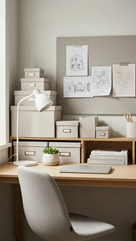 Storage doesn’t have to be boring. In fact, it’s one of the easiest ways to make a cheap office look styled.