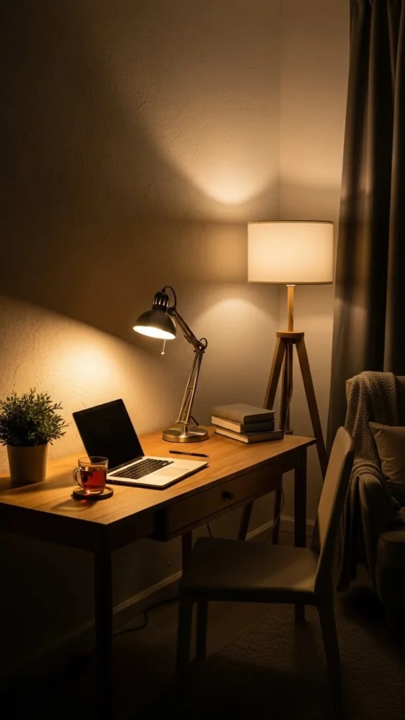 Lighting can change the entire mood of your office. For long workdays, avoid harsh light.