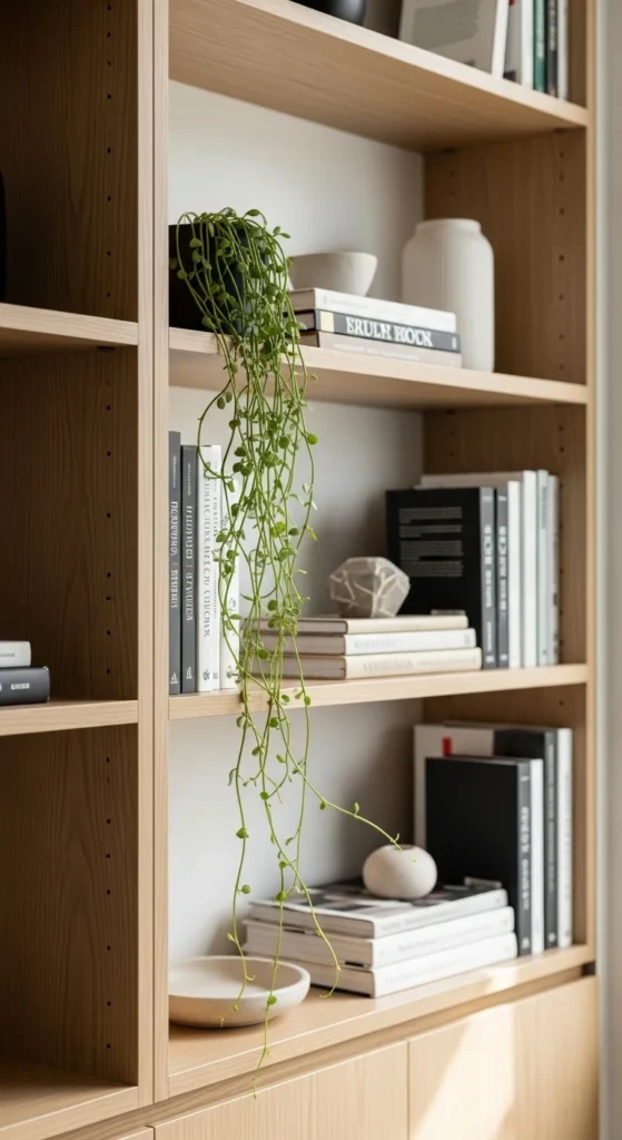 Plants soften shelves and prevent them from feeling rigid.