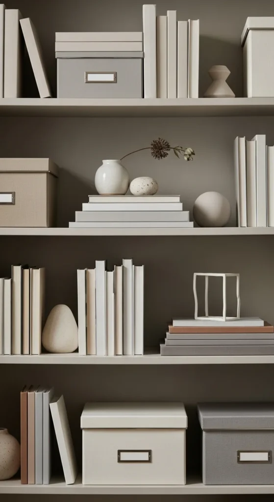 Use storage to hide papers, cords, or supplies. When practical items disappear visually, the shelf looks calmer without losing function.