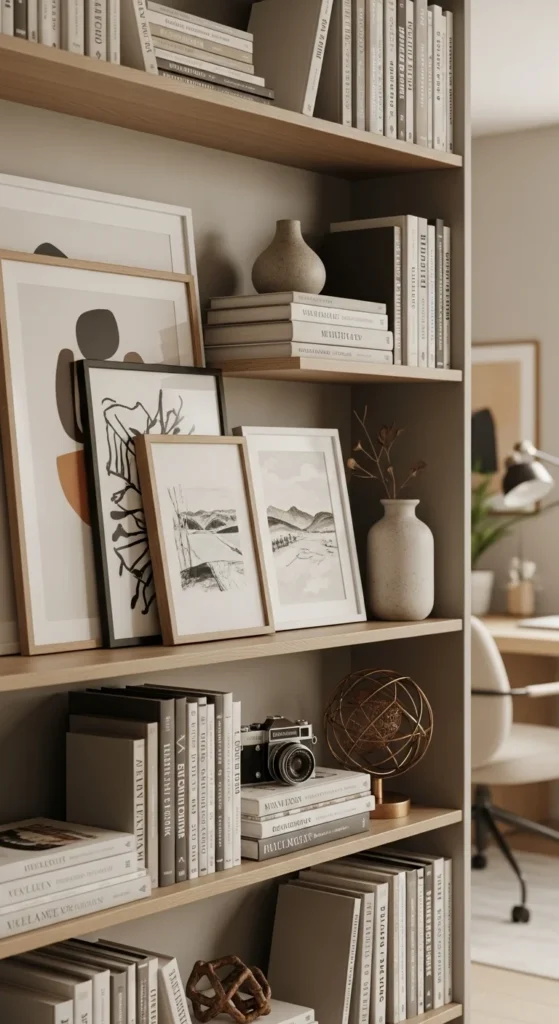 Lean framed prints behind books or objects. This adds depth and softness without taking up extra room. Keep frames simple and colors muted.