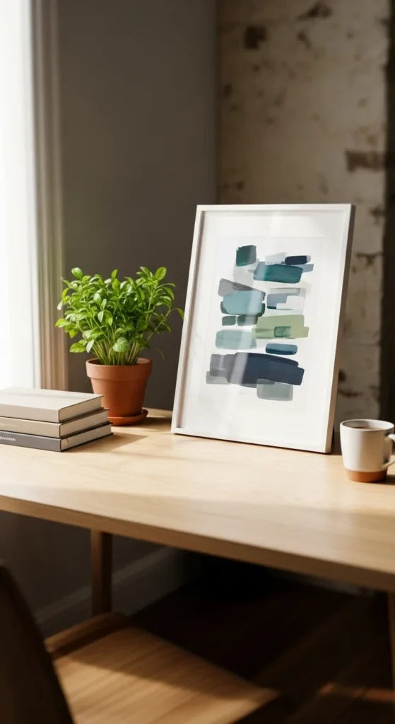 - Light wood or warm metal accents