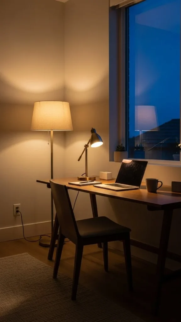 Harsh lighting can make even a beautiful room feel uncomfortable. Soft lighting makes a modern office feel warm and relaxed.