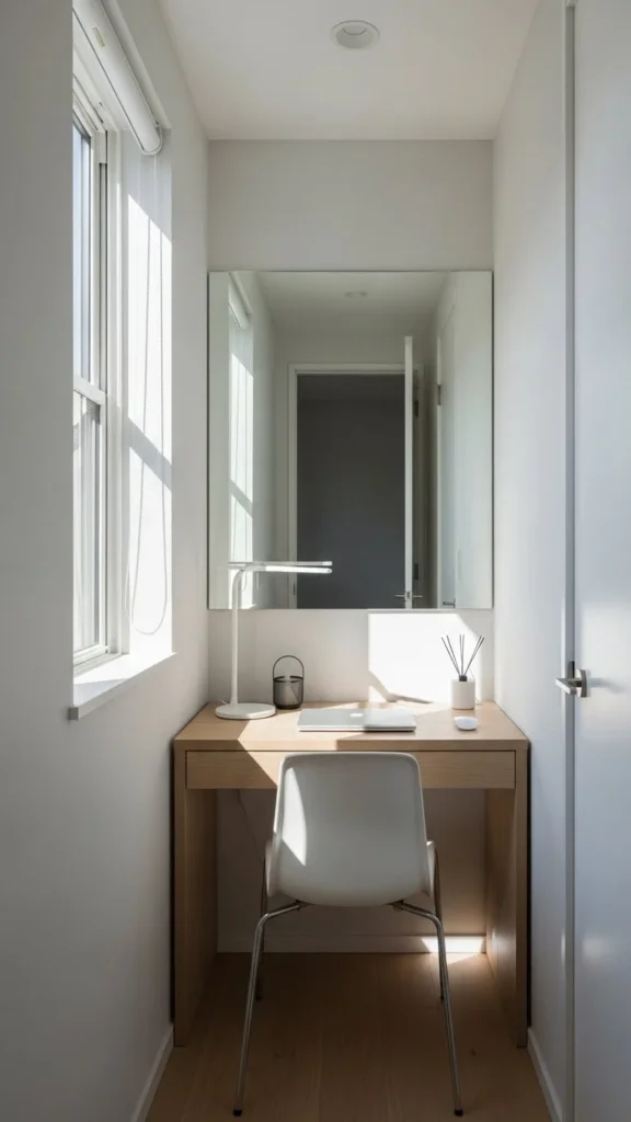 Mirrors are one of the easiest ways to make a small office feel bigger. They reflect both light and space.