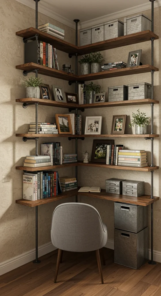 Pipe shelving combines function and industrial aesthetics.