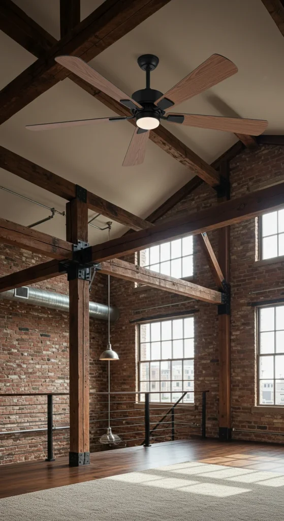 Choose fans with black or metal housings and natural wood blades to tie into the industrial theme.